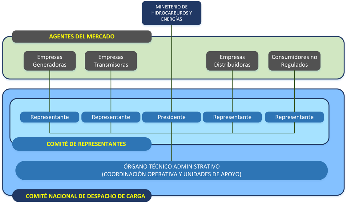 El CNDC está organizado en un Comité de Representantes y el Órgano Técnico Administrativo que funciona bajo la responsabilidad ejecutiva del Presidente del CNDC. Mediante Decreto Supremo Nº 29624, se aprueba el Reglamento de Funciones y Organización del CNDC, modificado por la disposición Final Segunda del Decreto Supremo N° 071 y N° 29894 de 07 de febrero de 2009, que establece que el Presidente del CNDC, es la máxima autoridad ejecutiva del CNDC. El Comité de Representantes, está compuesto por: El Presidente que es nominado por el Ministerio de Hidrocarburos y Energías, un representante de las empresas generadoras, un representante de las empresas transmisoras, un representante de las empresas distribuidoras y un representante de los consumidores no regulados. El Comité de Representantes celebra reuniones periódicas para tratar asuntos relacionados con el funcionamiento del MEM, adoptando decisiones que son obligatorias para los Agentes del MEM, conforme establece el Artículo 18 del ROME, aprobado mediante Decreto Supremo Nº 26093, de fecha 2 de marzo de 2001. Según el marco legal vigente, el CNDC está conformado por el Comité de Representantes y el Órgano Técnico Administrativo de acuerdo a la siguiente organización: